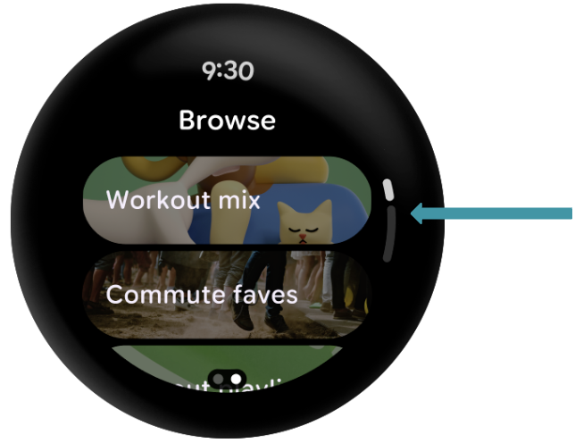 Because you will be using AppScaffold and ScreenScaffold,you'll also get a curved text time at the top and a scrolling indicator tied to the side of the device.