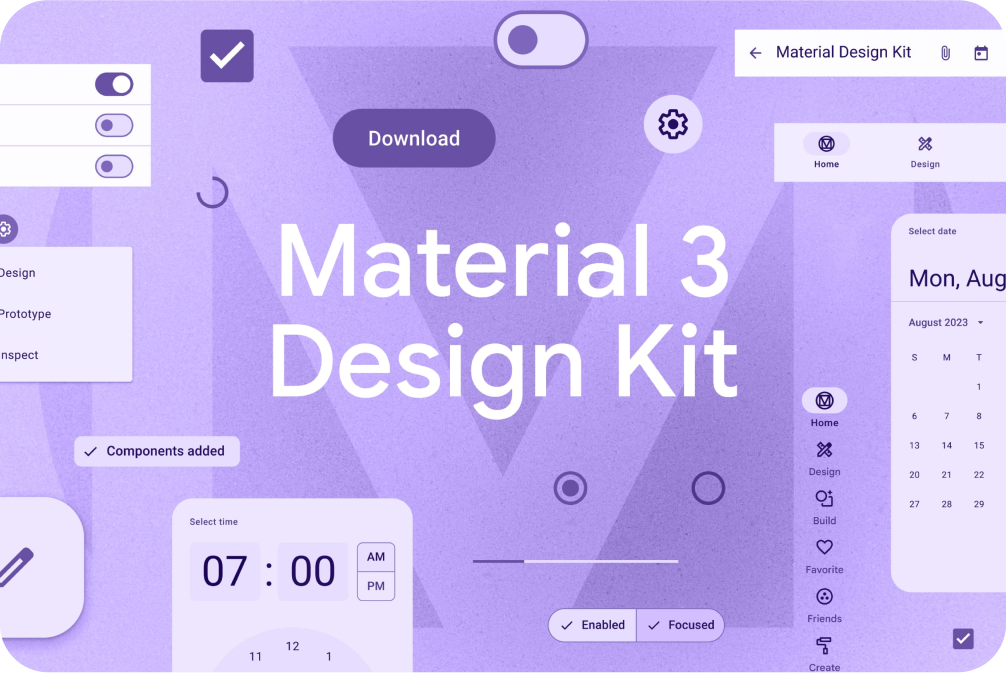 Adopt Material Design styles including sizes, scaling, large target sizes, colors, and typography.