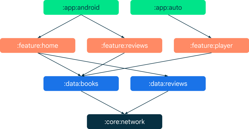 | قابلیت استفاده مجدد | ماژولارسازی فرصت هایی را برای به اشتراک گذاری کد و ساخت چندین برنامه از یک پایه فراهم می کند. ماژول ها به طور موثر بلوک های سازنده هستند. برنامه ها باید مجموع ویژگی های آنها باشند که در آن ویژگی ها به عنوان ماژول های جداگانه سازماندهی شده اند. عملکردی که یک ماژول خاص ارائه می دهد ممکن است در یک برنامه خاص فعال شود یا نباشد. برای مثال، یک :feature:news میتواند بخشی از برنامه طعم و لباس نسخه کامل باشد اما بخشی از طعم نسخه آزمایشی نباشد. |